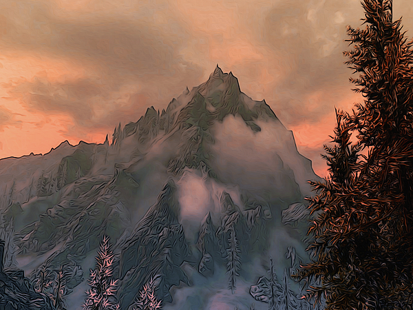 Autumn has arrived and winter is ahead of us. The imposing mountains, only partially softened by the beauty and delicacy of this sunset. Around us we are surrounded by trees and dense forests, while in front of us the mountains are majestic, covered with snow and ice.